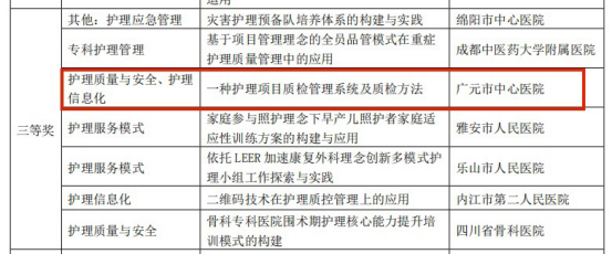 四川省护理质控中心于5月6日-22日举办了全省“护理管理创新奖”的评选活动,对全省上报的21个护理管理创新模式或案例进行颁奖。经专家委员会评定,我院“一种护理项目质检管理系统及质检方法”案例荣获四川省“护理管理创新奖”三等奖。