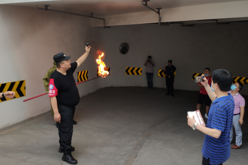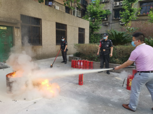 安保人员现场讲解、示范如何使用灭火器、消防栓、水带、水枪