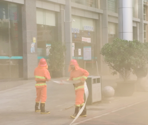保卫科随后在外科大楼一楼组织了以医保价格科发生火灾事故为情景的应急灭火演练。浓烟四起,院内的自消系统启动了火灾自动报警,保卫科接到消防控制室值班人员的报警后,立即组织人员按应急预案展开应急处置。马上安排第一灭火小组赶到现场实施扑救,因火势较大,随即增派了第二灭火小组协助支援。警戒组现场警戒,将周边的围观人员隔离;疏散组将受困人员进行疏散;救援组进入火灾区,抢救伤员,将伤员转移到安全地,最终采用消防栓对准火点将其扑灭。