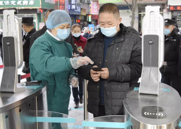 现代化的智能道闸前,进入院内的行人在工作人员的耐心引导下,自觉按照“一米间距”排队,有序通过智能道闸口的智能“双码”查验和体温检测;对进入院内车辆的驾乘人员,工作人员主动进行人工“双码”查验和体温检测。