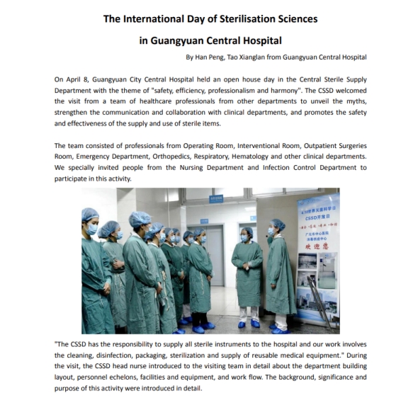 近日,医院灭菌科学世界联盟官方网站(WFHSS)发布了各医疗单位消毒供应中心灭菌科学日系列报道的相关信息。我院消毒供应中心报道在各医疗单位中脱颖而出,被WFHSS专版进行报道。