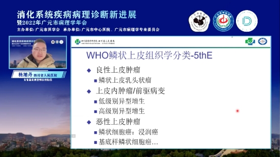 杨旭丹教授在《食管基底层型鳞状细胞癌》的授课中,对食管基底层型鳞状细胞癌的定义与分类、临床病理特征以及浸润模式的识别、鉴别诊断等方面做了讲解,还将日本食管鳞状上皮组织学分类与WHO食管鳞状上皮组织学分类做了比较。