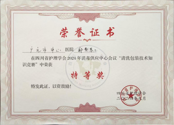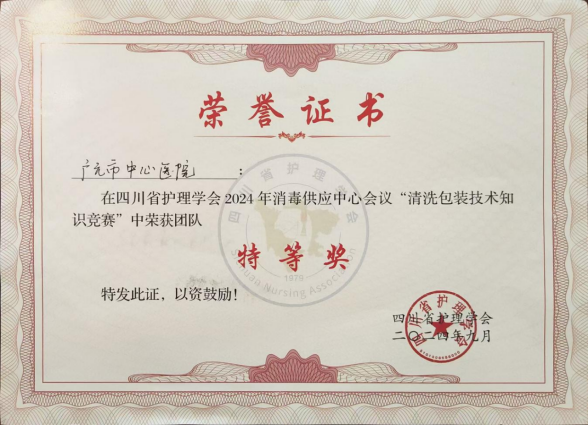 近日,由四川省护理学会消毒供应中心专业委员会举办的“2024年四川省消毒供应清洗包装技术知识竞赛”在乐山市圆满落幕。由我院消毒供应中心郑素蓉和市精卫中心、旺苍县中医医院护理代表组成的广元“梦之队”,以优异的成绩获得团体特等奖和个人特等奖。
