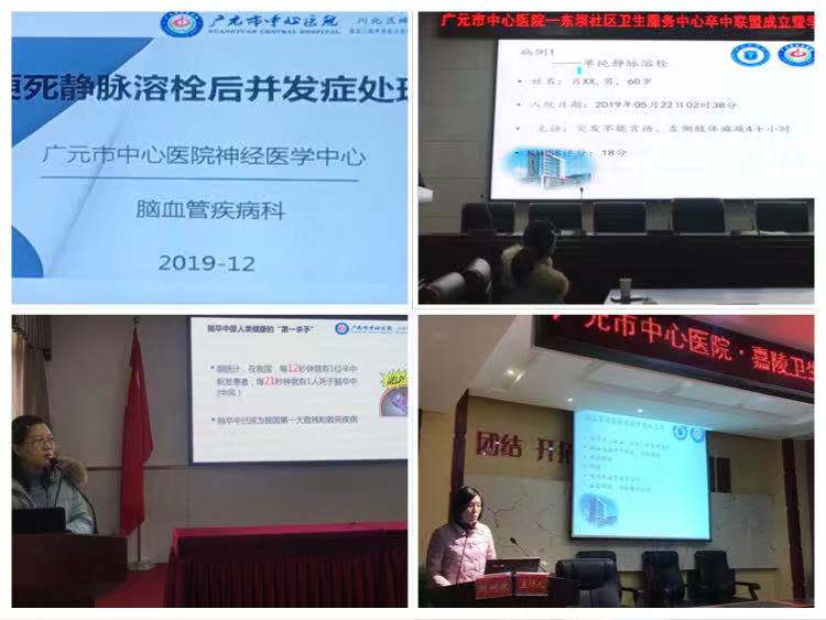 12月16日—12月26日在院领导及职能部门的支持下,由广元市中心医院神经医学中心何明方主任带领中心部分医务人员到社区及县区医院进行了卒中联盟成立暨学术宣讲会,与嘉陵社区、雪峰社区、南河社区、东坝社区、上西社区卫生服务中心以及利州区中医医院、利州区人民医院、昭化区人民医院建立了以广元市中心医院为圆心的“半小时卒中紧急救治圈”